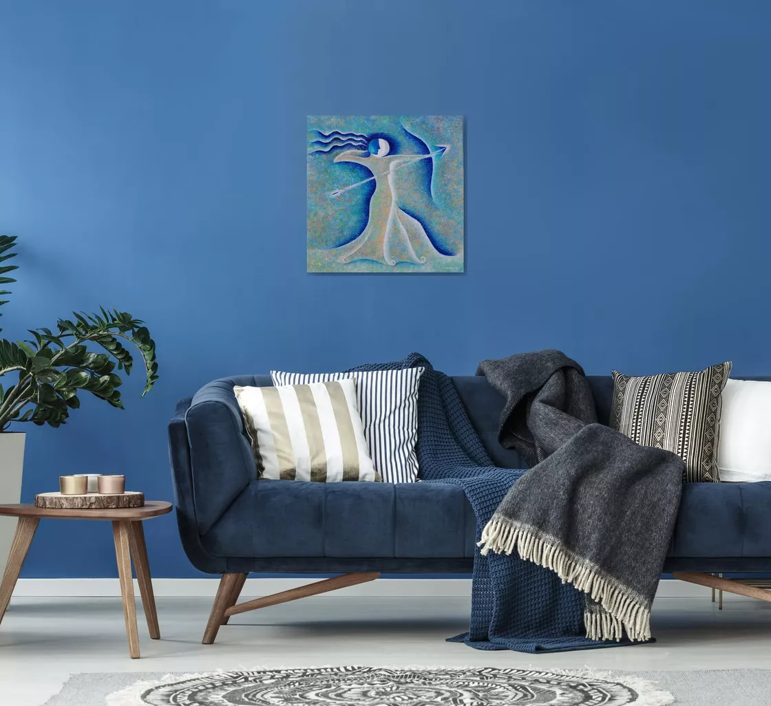The composition is defined by geometric shapes and layered textures, with curves and sharp angles creating a sense of tension and balance. The impasto technique was central to this piece, allowing me to build a surface that feels alive, much like the natural world Artemis embodies. Rich earth tones and contrasting blues symbolize her connection to the land and sky, grounding the piece in both myth and materiality.