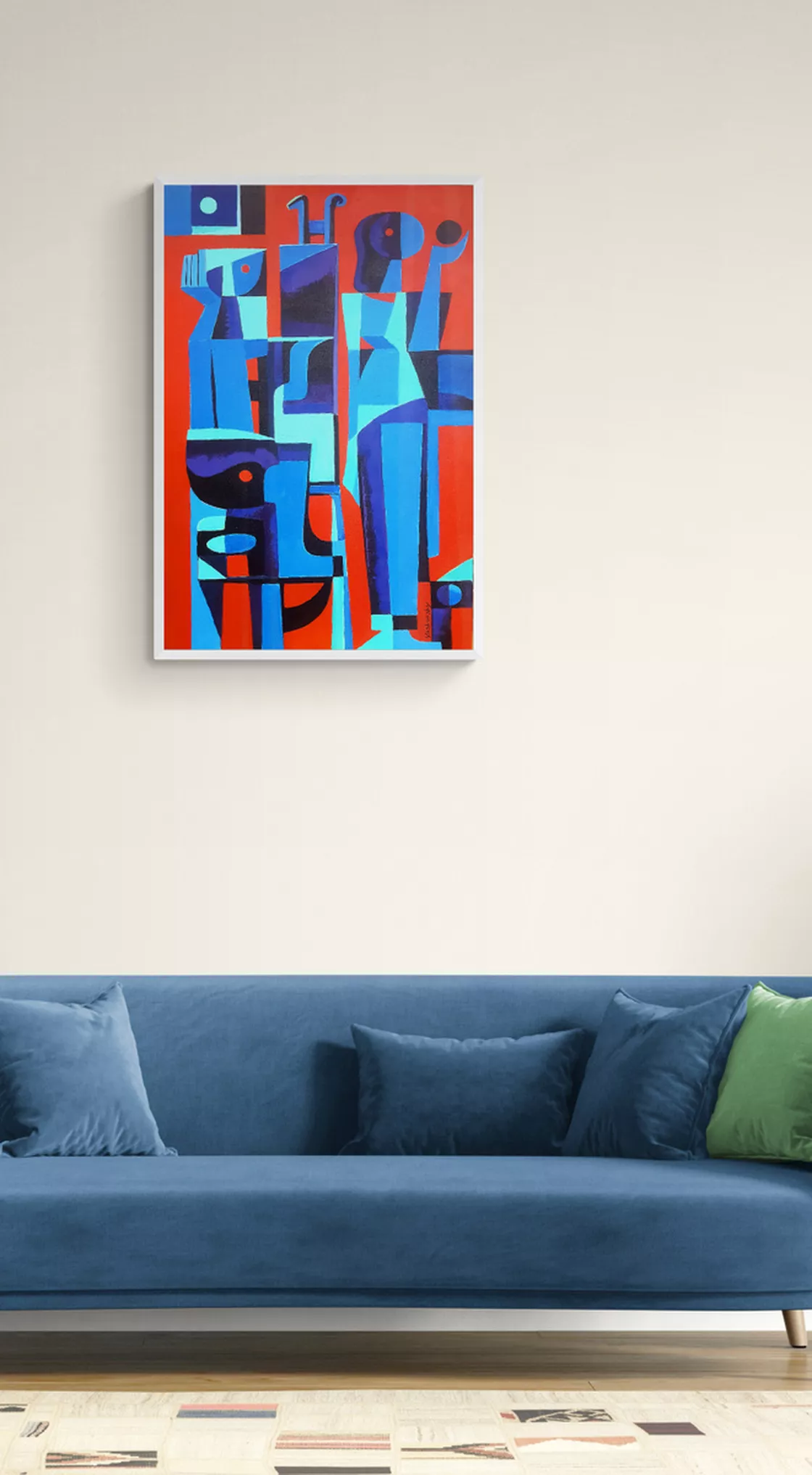 Vertical geometric composition, richly textured, high contrast. In blue and red. Vivid palette. Modern style inspired by cubism of Picasso and Braque.The Artist is sitting at the easel. The model is standing in front of him and holding a black ball balancing white moon in the small window. Shapes are simplified creating a geometric pattern on the canvas.