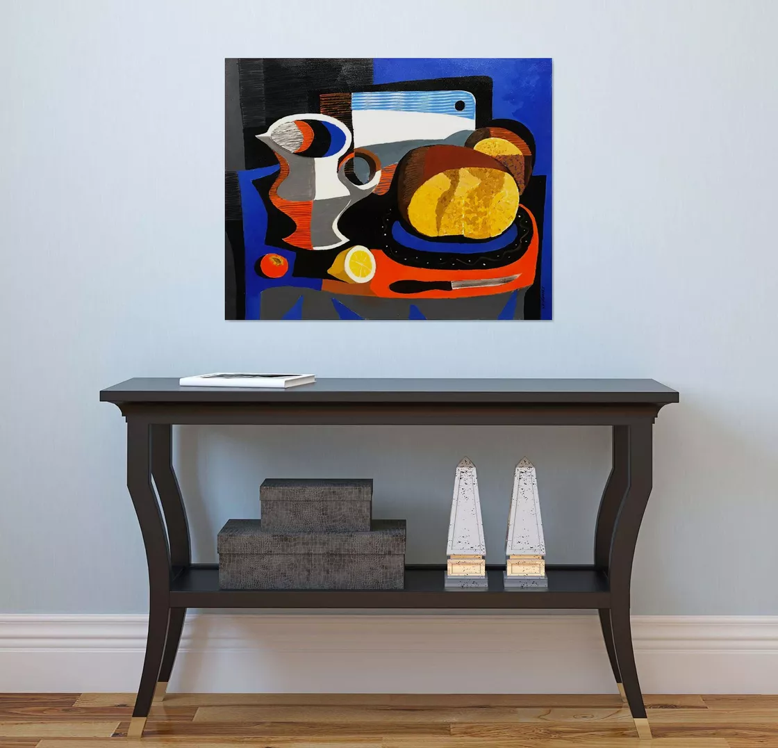 100% handmade colourful acrylic painting titled "Bread, Lemon, and Pomegranate" was created with premium quality acrylic colours on a cotton canvas.