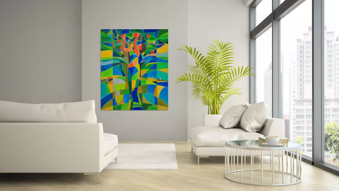 The dryad (tree spirit) —emerges from an abstract, kaleidoscopic landscape of greens, blues, and golden hues. She is both separate from and inseparable with her surroundings — becoming tree, becoming land, becoming sky, inviting a viewer to experience things beyond the ordinary perception of nature. The painting is initiated by the design of a stained glass panel, suggesting the use of simple geometric forms and large colour areas. Mixing oil paints with wax allows the surface to appear matte and richly textured yet the colour layers seem translucent. The repeating geometric patterns on a large scale canvas welcomes the eye to soar rhythmically over the landscape reaching a meditative state of mind. Fruit Dryad — rooted in myth yet rendered in modern language—evokes themes of transformation, growth, and our deep entwinement with the living world.