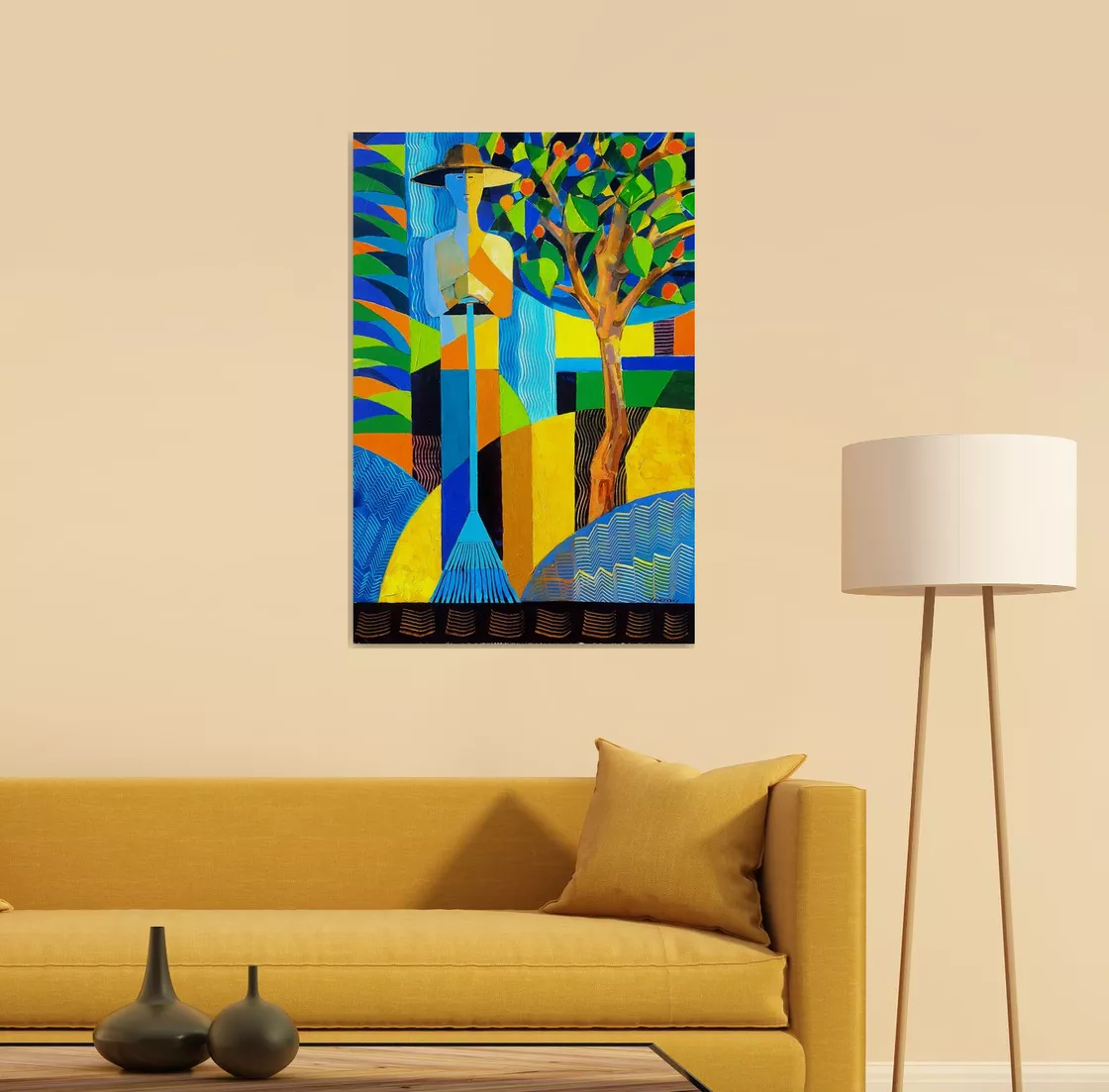 Vertical geometric composition, richly textured, high contrast. In blue and yellow. Vivid palette. Modern style inspired by Matisse and fauvism.Shapes are simplified creating a geometric pattern on the canvas.