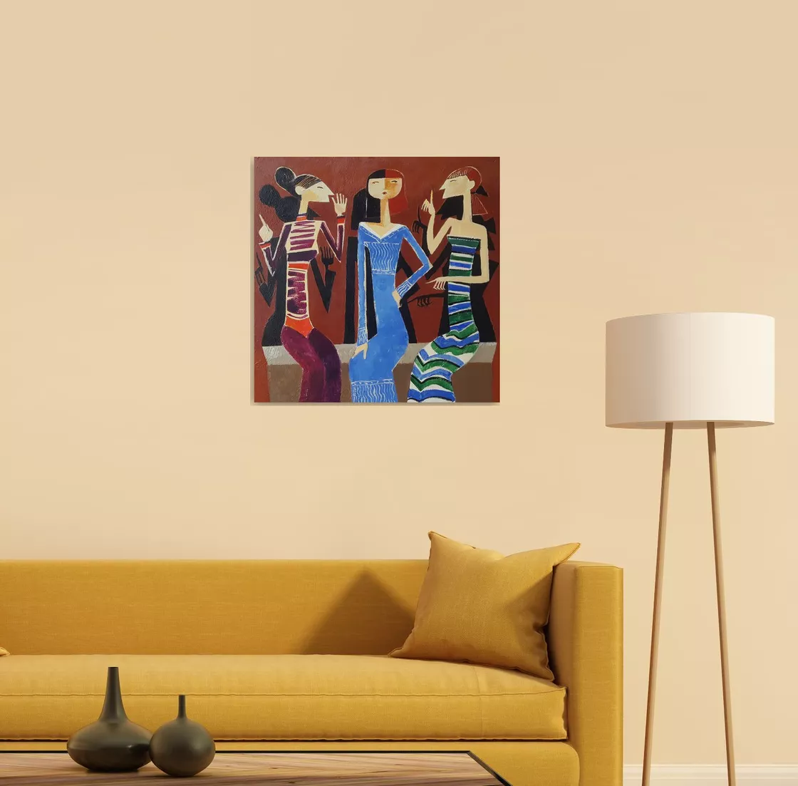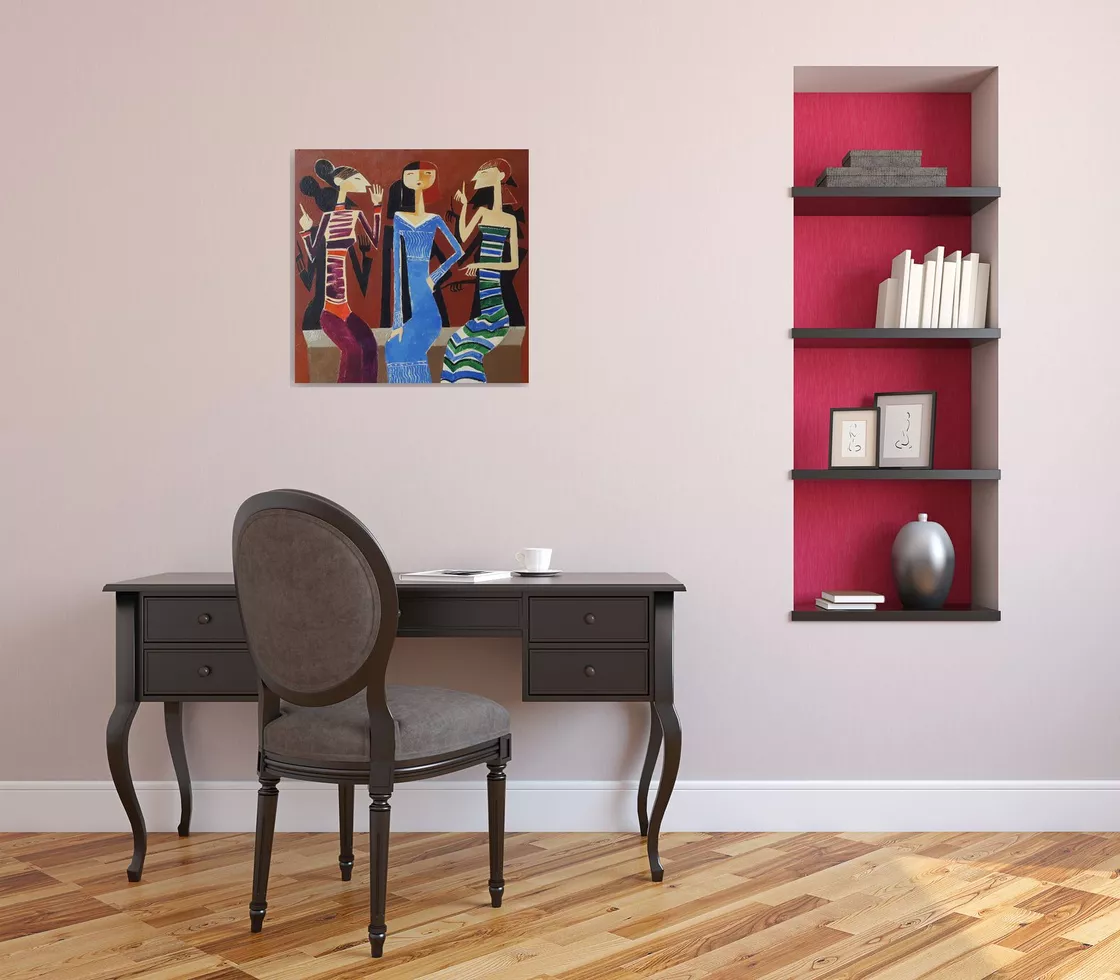 100% handmade colourful acrylic painting titled "Gossip" was created with bright acrylic colours on a premium quality 100% cotton canvas.