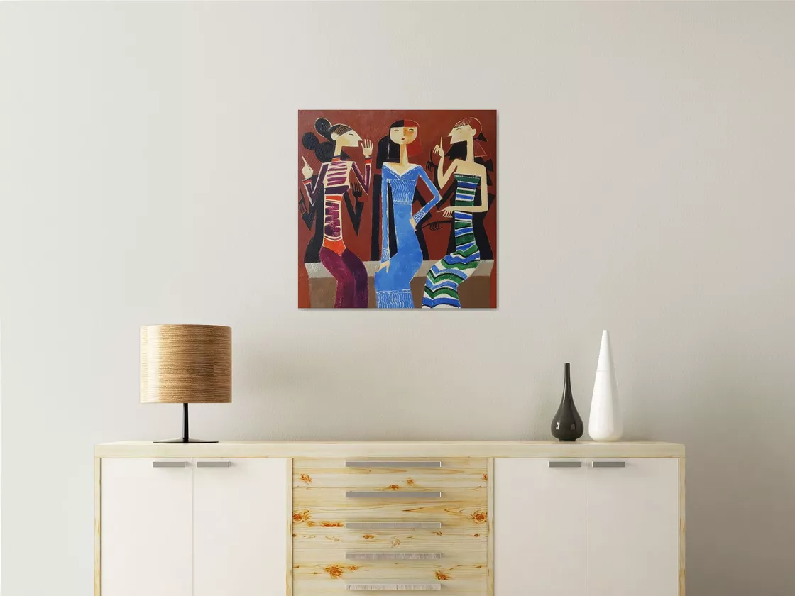 100% handmade colourful acrylic painting titled "Gossip" was created with bright acrylic colours on premium quality 100% cotton canvas. Rich texture. Square composition.