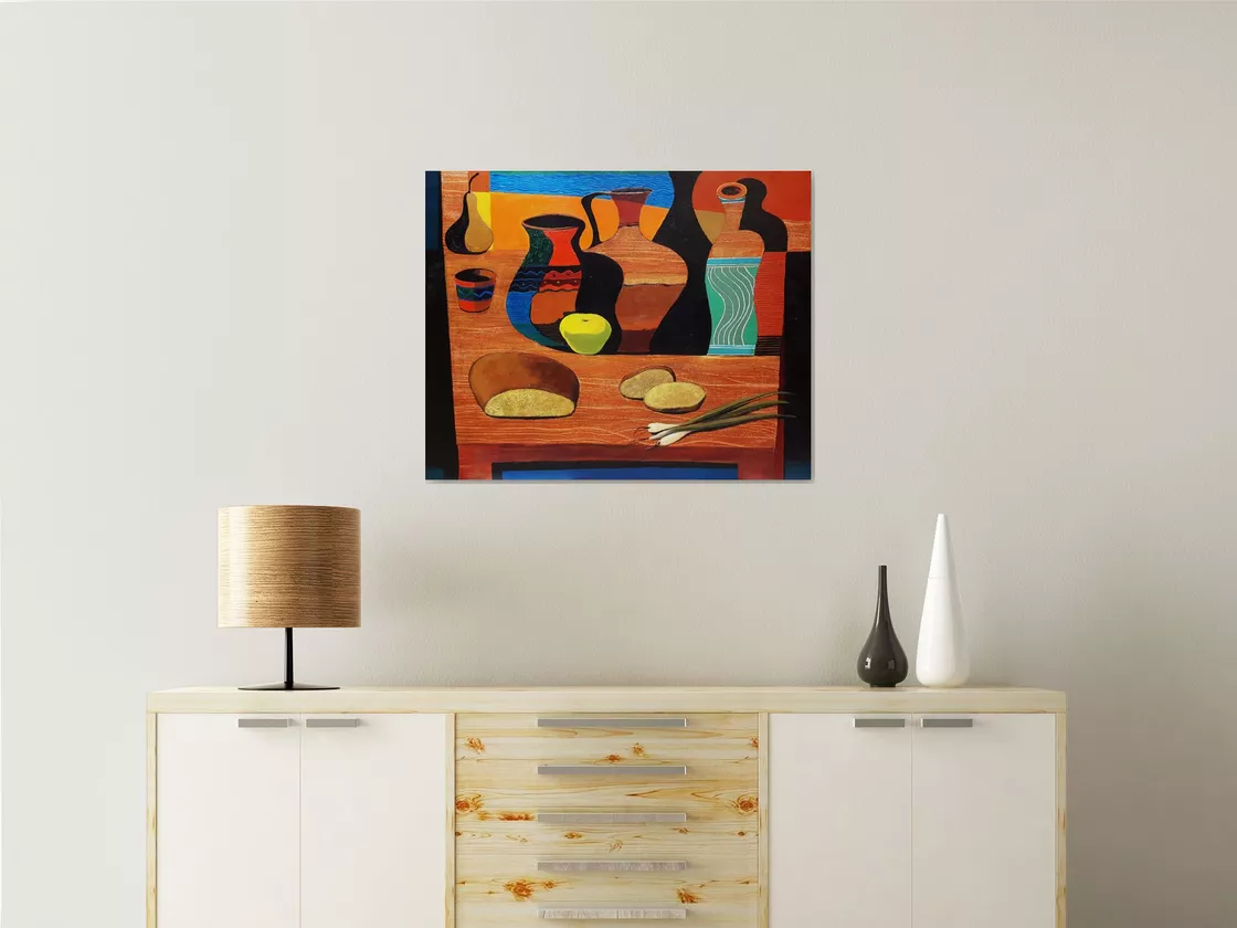 100% handmade colourful acrylic painting titled "Jars, Bread and Onion" was created with premium quality acrylic colours on a cotton canvas.