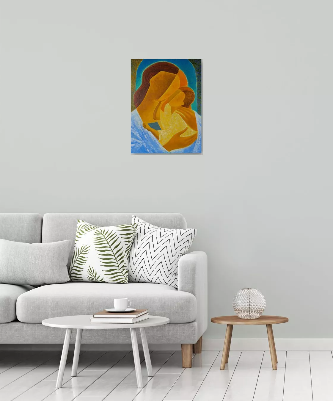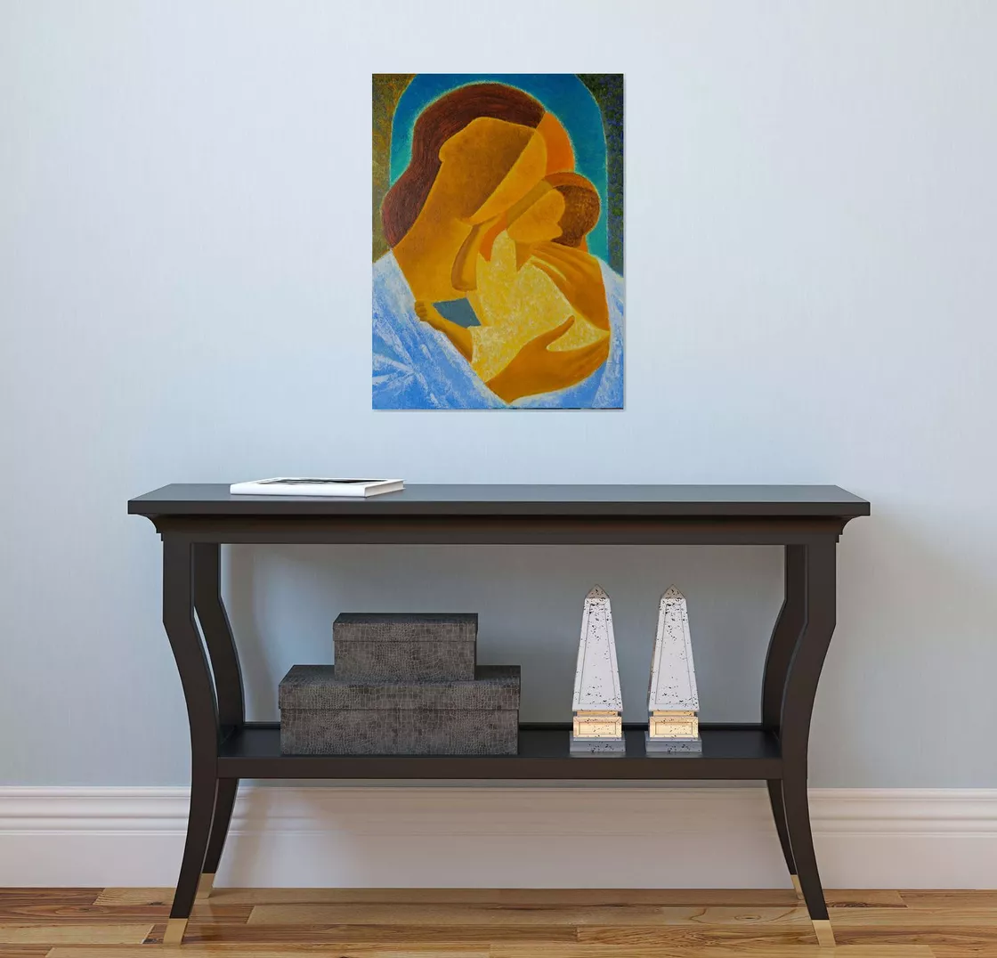 While rooted in tradition, the abstraction brings a modern sensibility to the work, allowing the viewer to connect to its universal themes of love, care, and devotion. This fusion of spiritual tradition and contemporary artistry celebrates the sacred and human aspects of motherhood