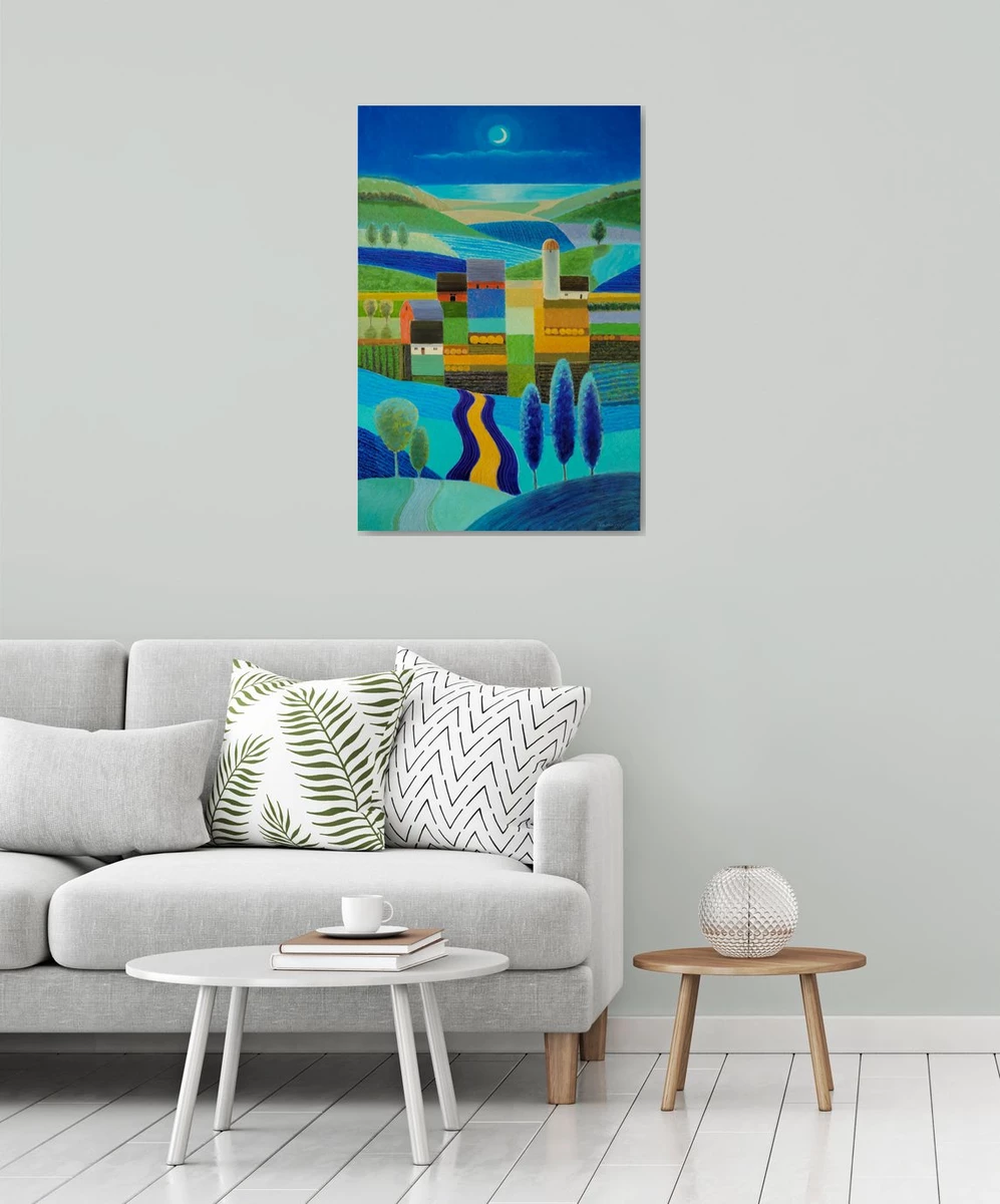 A serene rustic landscape inspired by Prince Edward County, this painting captures the quiet poetry of farmland under a luminous crescent moon. Rolling hills unfold in layered bands of turquoise, deep blue, and vibrant green, leading the eye toward a tranquil lake shimmering beneath the night sky. Geometric farm buildings and a solitary silo anchor the composition, their warm ochres and earthy tones glowing softly against the cool surroundings.