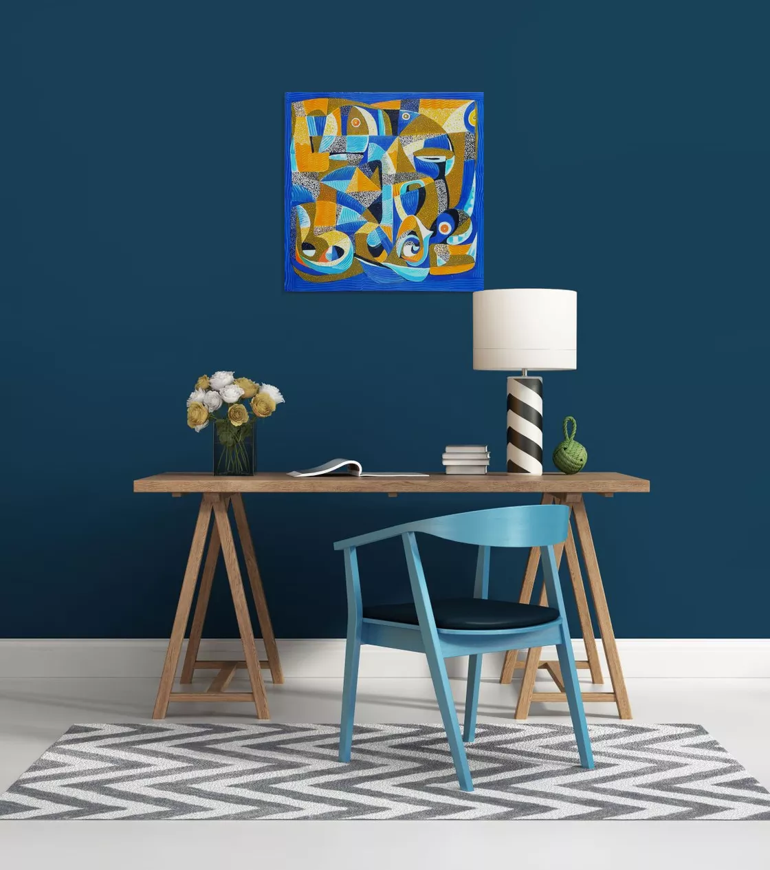 Ready to hang artwork. Ideal or a living room, dining room, bedroom, or office modern interior. Rich texture. Square composition.