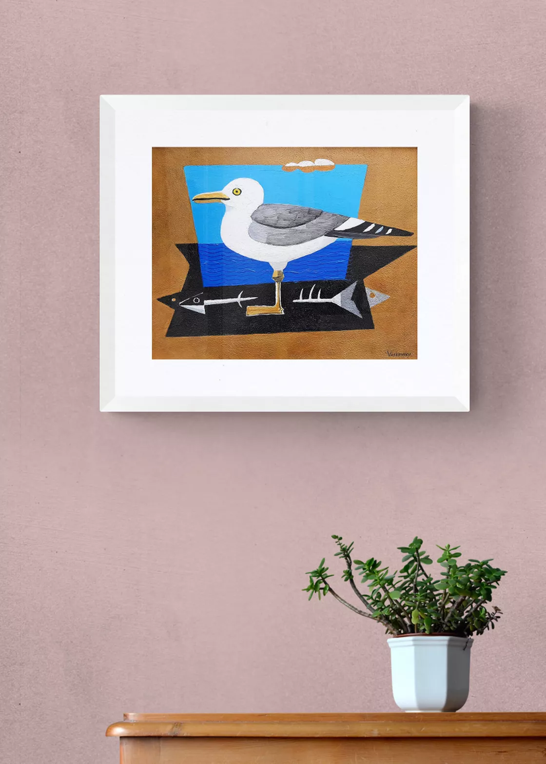 100% handmade colourful acrylic painting titled "Seagull and Fish Bone" was created with premium quality acrylic colours on a 100% cotton canvas.