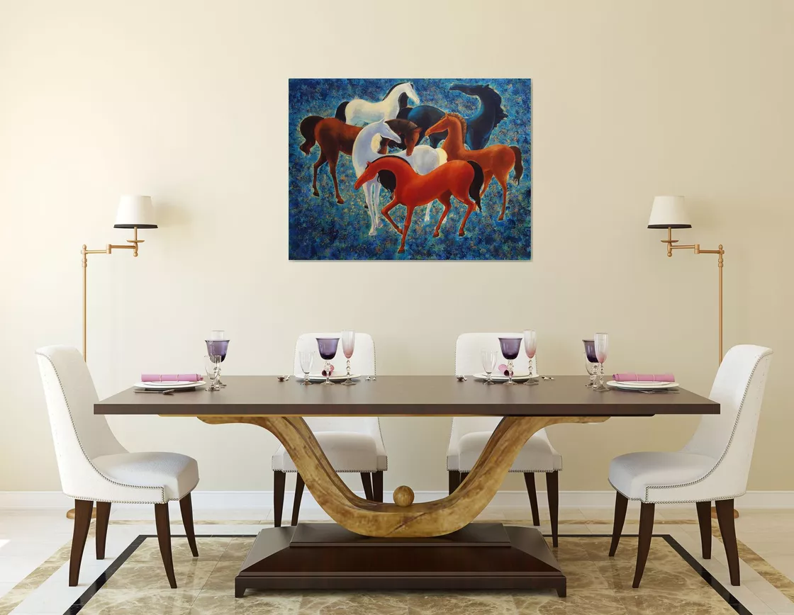 100% handmade colourful acrylic painting titled "Six Horses" was created with premium quality colours on a 100% cotton canvas.