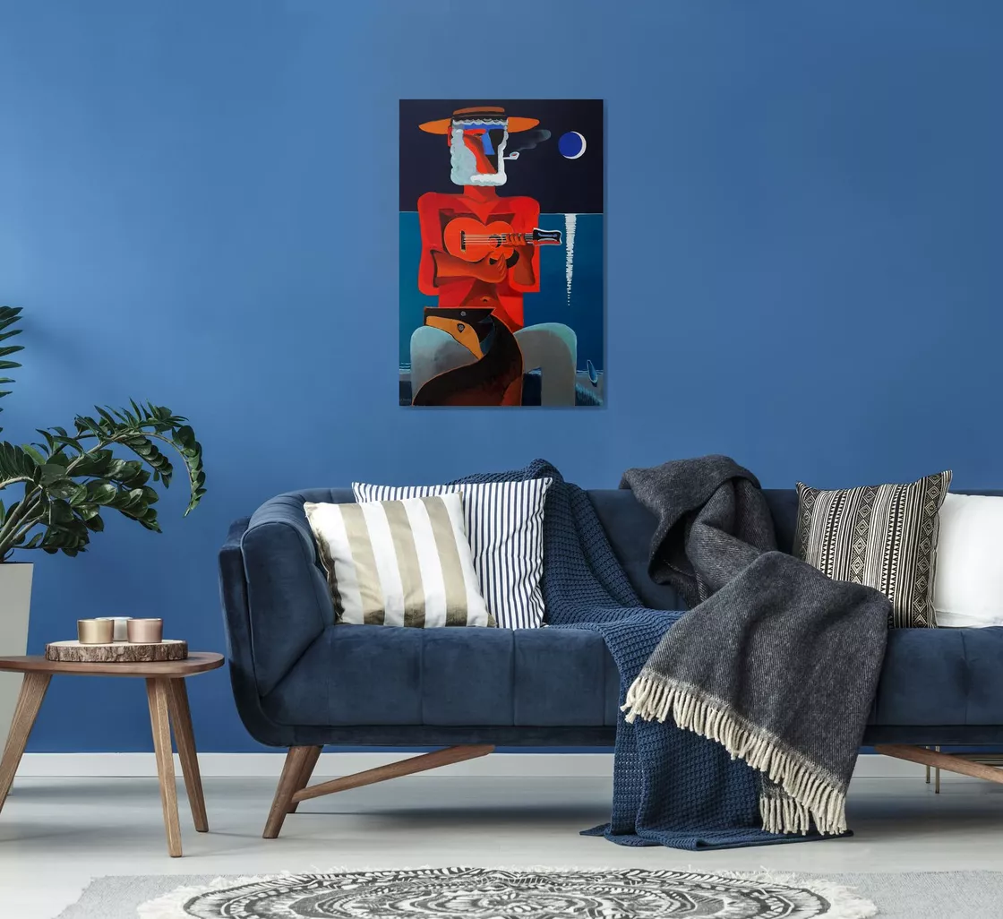 100% handmade colourful oil painting titled "Ukulele Player and Dog" was created with premium quality colours on a 100% cotton canvas. The edges are painted to prolong the painting. Ready to hang artwork. Ideal for a living room, dining room, bedroom, or office modern interior.